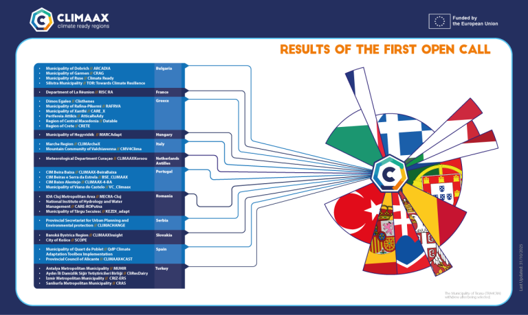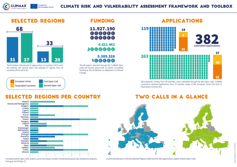 Thirty-two regions from 13 countries have been selected in CLIMAAX’s first open call to receive a total of over €5.4 million in funding. Each selected project is expected to receive up to €300,000.