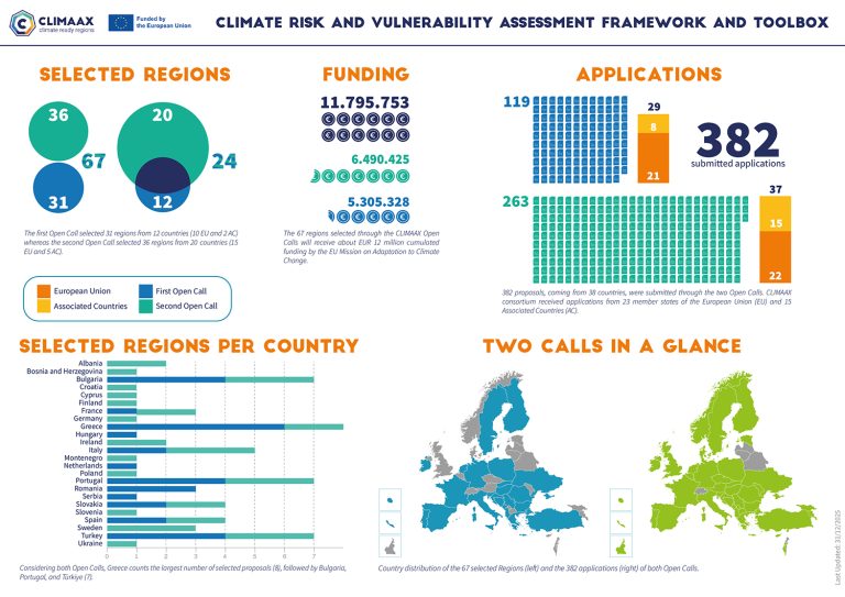 Thirty-one regions from 12 countries have been selected in CLIMAAX’s first open call to receive a total of over €5.3 million in funding. Each selected project is expected to receive up to €300,000.